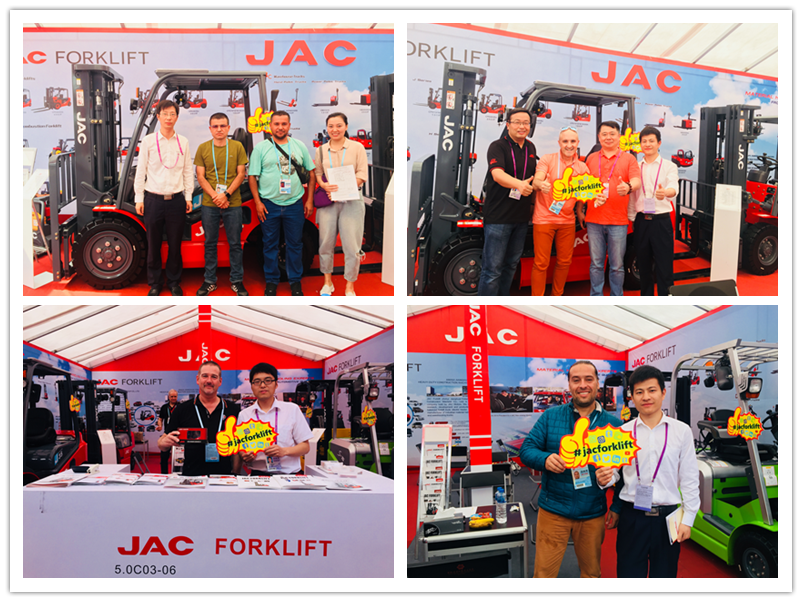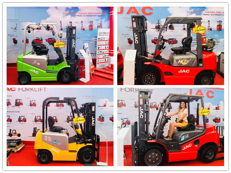 本次展會江淮重工攜帶了內燃、電動、倉儲三大系列五款產品,全 面展示了CPCD35J搭載進口發動機叉車、CPQYD25H雙燃料叉車、CPD16J電動叉車、CPD15S搭載集成操作電動叉車、CBD15鋰電池全電動搬運車等明星產品,其艷麗的外觀與優 秀的性能贏得了海內外客戶的一致好評。